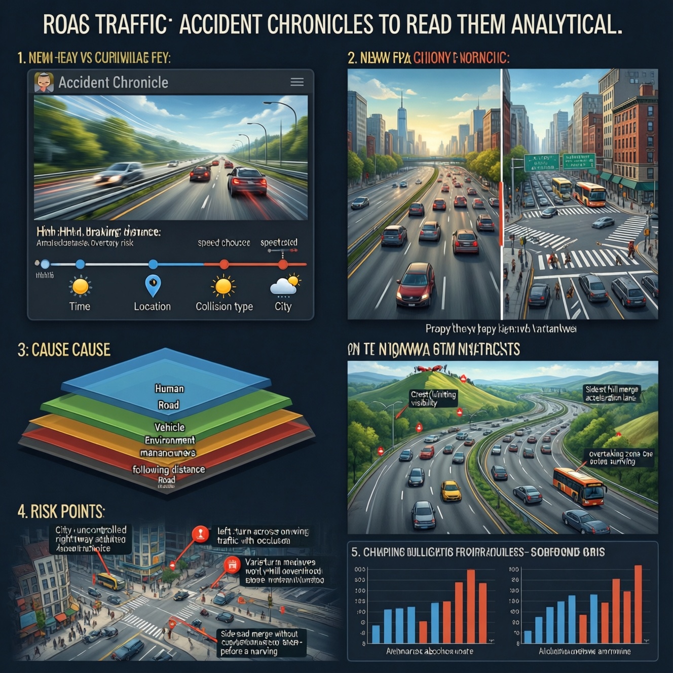 На загородных дорогах опасны участки, где водителю не хватает времени на распознавание ситуации: затяжные повороты с переменным радиусом, гребни/переломы профиля, примыкания второстепенных дорог без полос разгона, а также зоны обгона перед сужением. Словесная диаграмма здесь другая: вообразите линию маршрута, на ней три «пика» риска — перед населенным пунктом (смешение скоростей), на подъезде к мосту/развязке (перестроения), и на связке поворотов (потеря устойчивости). Сравнение с «аналогами» из телематики грузоперевозок показывает: когда компании ставят контроль резких торможений и ускорений, число инцидентов падает именно на этих пиках — значит, проблема часто в стиле вождения и прогнозировании.
