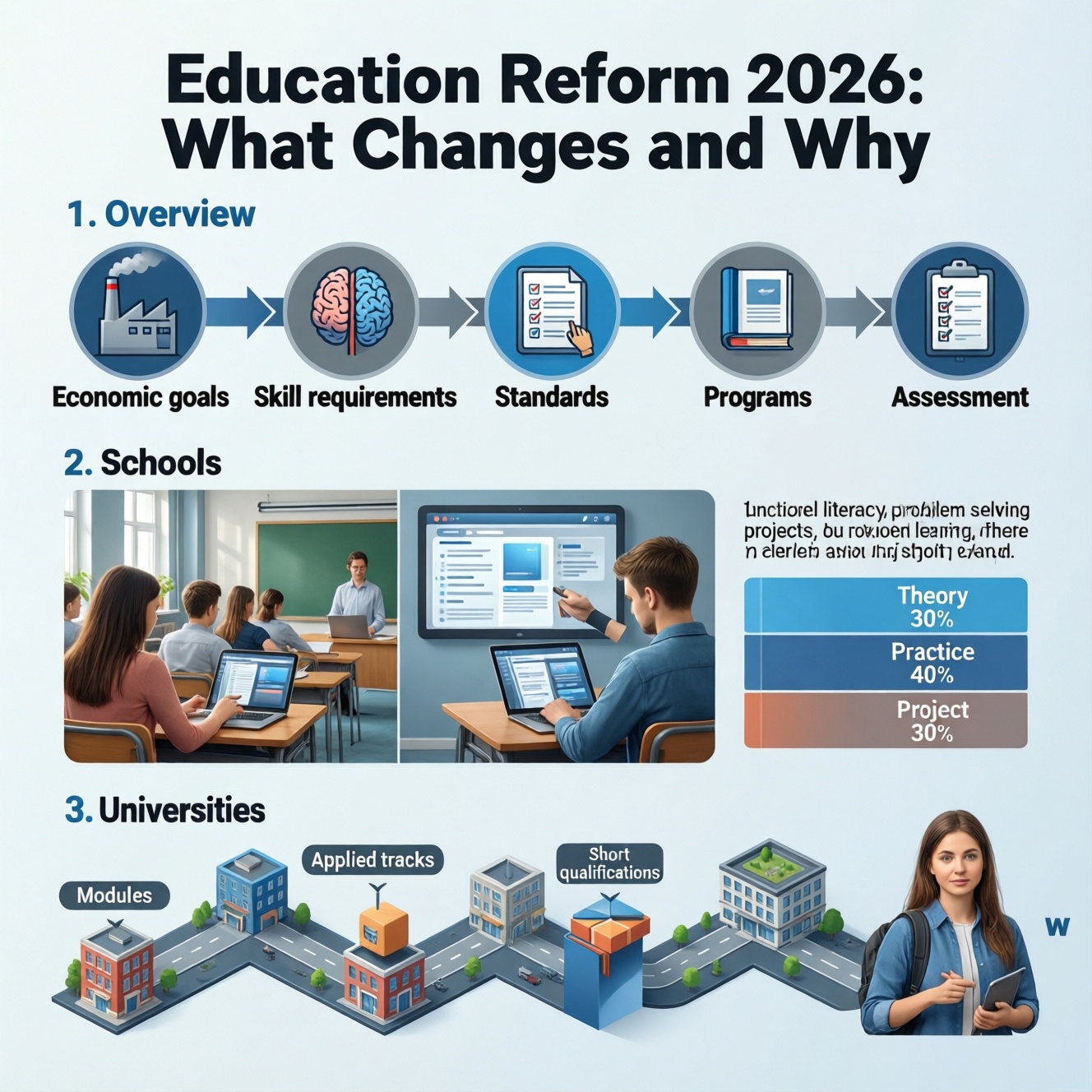 В 2026 на слуху сразу две формулировки: «изменения в школах 2026» и «реформа образования 2026». Под реформой корректнее понимать не разовую кампанию, а набор управленческих решений: обновление стандартов, переразметка учебных планов, новые требования к инфраструктуре и отчетности. В школах акцент смещается к функциональной грамотности и цифровым инструментам, а в вузах — к прикладным трекам и связке с работодателями. Схема процесса выглядит так: «цели экономики → требования к навыкам → стандарты → программы → оценка результатов».