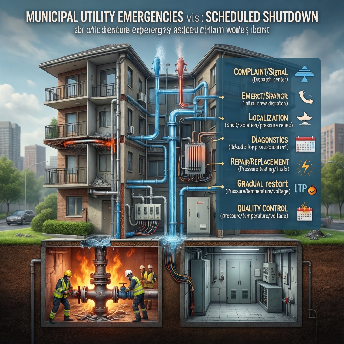 Коммунальная авария — это внезапный отказ элемента инженерной системы дома или городской сети (труба, задвижка, кабель, трансформатор, теплопункт), из‑за которого услуга пропадает или становится опасной/некачественной. Важная деталь: авария почти всегда «не по расписанию», и у нее есть две параллельные задачи — быстро локализовать риск (перекрыть воду, отключить участок сети, сбросить давление) и затем восстановить подачу ресурса.